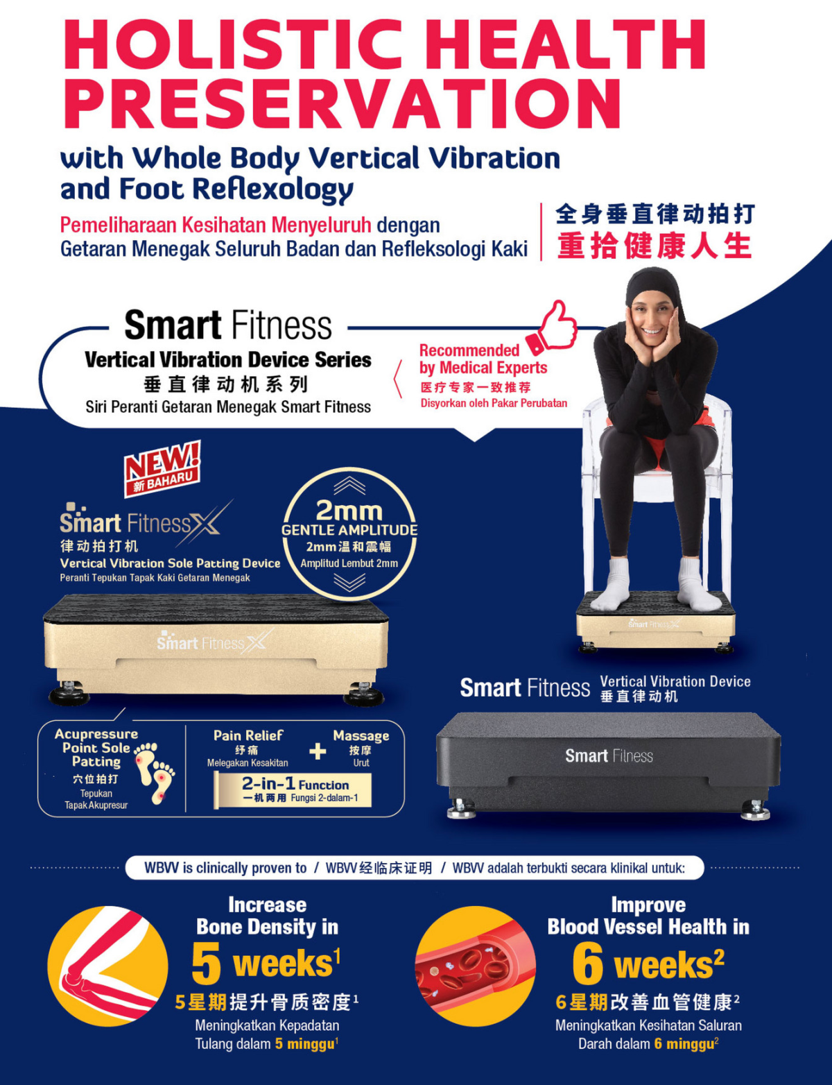 Smart Fitness X is an innovative fitness and wellness device equipped with advanced whole body vertical vibration (WBVV) technology and an intergrated acupressure point sole patting function, designed to benefit everyone. Utilising a vibrating platform to transmit low frequency vertical vibrations to the human body Smart Fitness X ensures highly efficient exercise without burdening your body, heart and lungs.